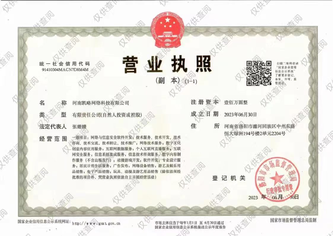 河南凯略网络科技有限公司,位于华夏文明重要的发祥地、国家历史文化名城洛阳,是在互联网深刻影响下应运而生的互联网软件及网络营销公司。公司整合众多平台资源研发出多项自主版权的软件产品,专注高效,积极进取,力求为更多的客户提供更好的营销体验服务丰富的推广经验和渠道资源是公司的特色优势,良好的售后服务是公司的品质保证,我们将用心服务好每一位客户,“诚信做人,认真做事”河南凯略网络科技有限公司愿与广大用户共创共赢,共同进步!